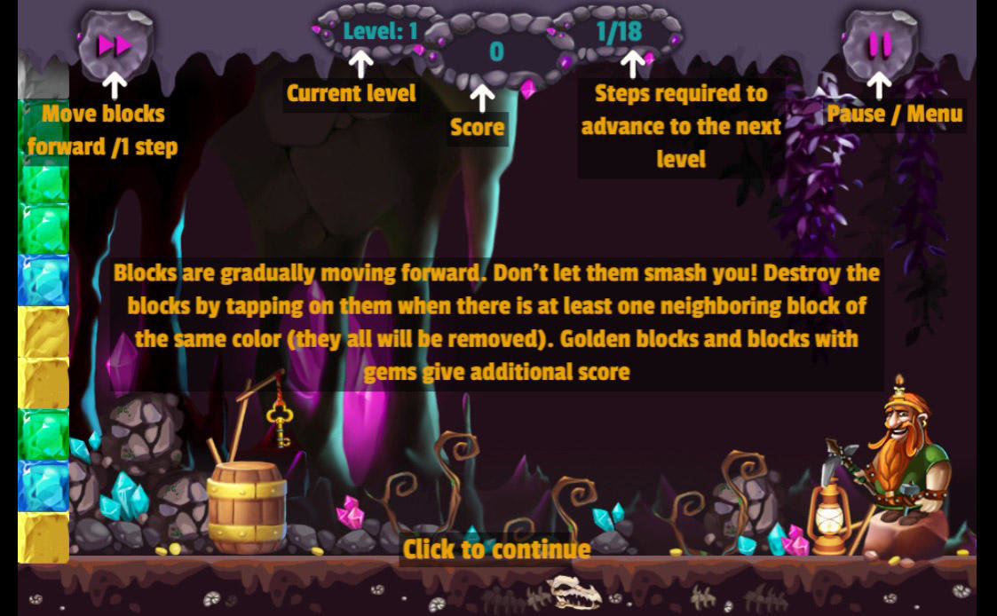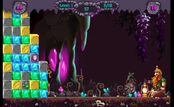 Sobald du einen Block zerstört hast, rutschen die darüber liegenden Steine nach unten und fallen in die Lücken. Ergattere Bonuspunkte, indem du die wertvollen goldenen Steine entfernst. Auf den grauen Steinen sind hin und wieder bunte Kristalle zu sehen, schaffst du es diese vom Spielfeld zu fegen, räumst du ebenso Bonuspunkte ab. Doch pass auf denn die Steine kommen immer näher und machen es dir schwieriger.