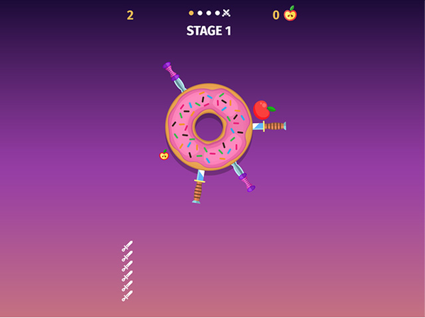 Bei Knife Smash geht es um das was der Titel verspricht. Versetz‘ dich in die Rolle von Willhelm Tell und versuche mit Messern Äpfel zu treffen. Doch keine Angst die Äpfel sind nicht auf dem Kopf von einem Menschen, sondern sie befinden sich auf einem drehenden Ball. In diesem Ball stecken bereits Messer, deine Aufgabe ist es deine Messer an freie Stellen zu feuern.