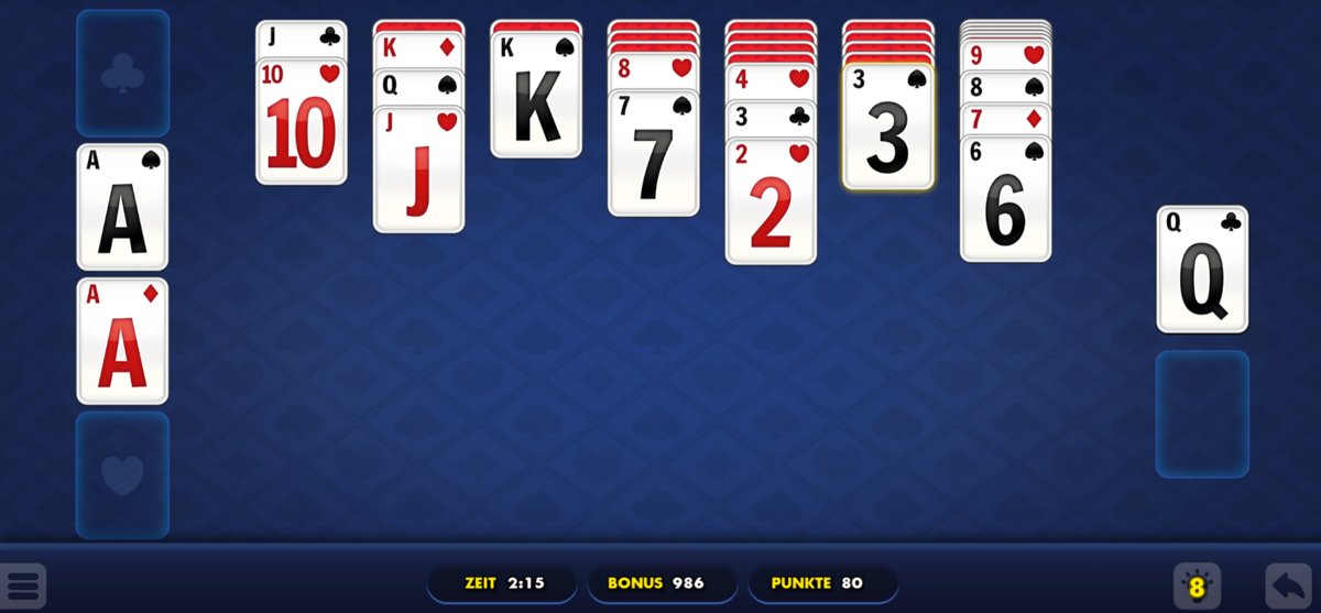 Spiele jetzt den Kartenspielklassiker schlechthin- Daily Solitaire Blue. Ohne Registrierung kannst du direkt durchstarten in dem kostenlosen online Spiel. Solitaire kann man zum reinen Zeitvertreib spielen, aber es dient auch der Meditation und trainiert vorrausschauendes Denken.