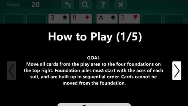 Ziel des Spiels ist das Bilden von vier Kartenstapeln für jede Kartenfarbe mit jeweils 13 Karten in jedem der vier Zielfelder. Die Karten in jedem Stapel müssen in aufsteigender Reihenfolge von niedrig (Ass) bis hoch (King) abgelegt werden. Zieh die Karten vom unteren Ende jeder Reihe, und lege sie an der gewünschten Stelle ab. Dabei kann jeder freier Platz nur jeweils von einer Karte belegt werden. Die Karten müssen in absteigender Reihenfolge (Ass zählt am Meisten) in einer Reihe platziert werden. Hast du den Dreh raus?